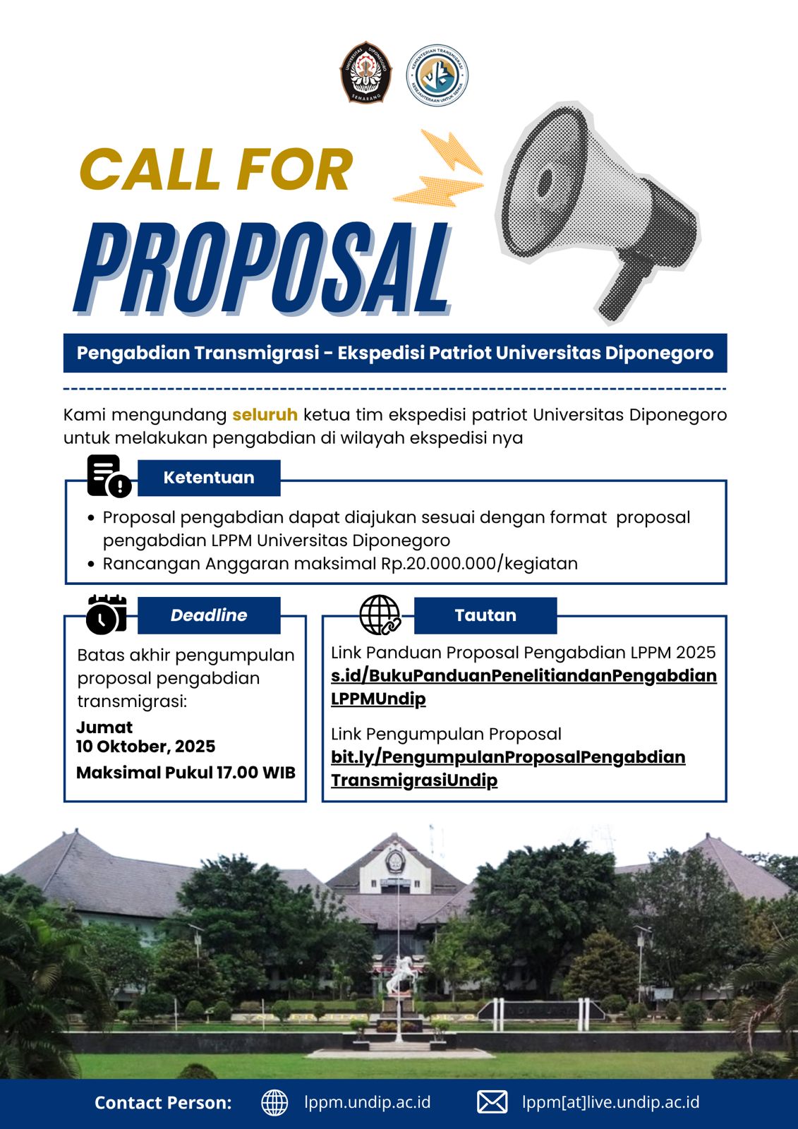Kami mengundang seluruh ketua tim Ekspedisi Patriot Universitas Diponegoro untuk melaksanakan pengabdian di wilayah ekspedisinya dengan ketentuan:
