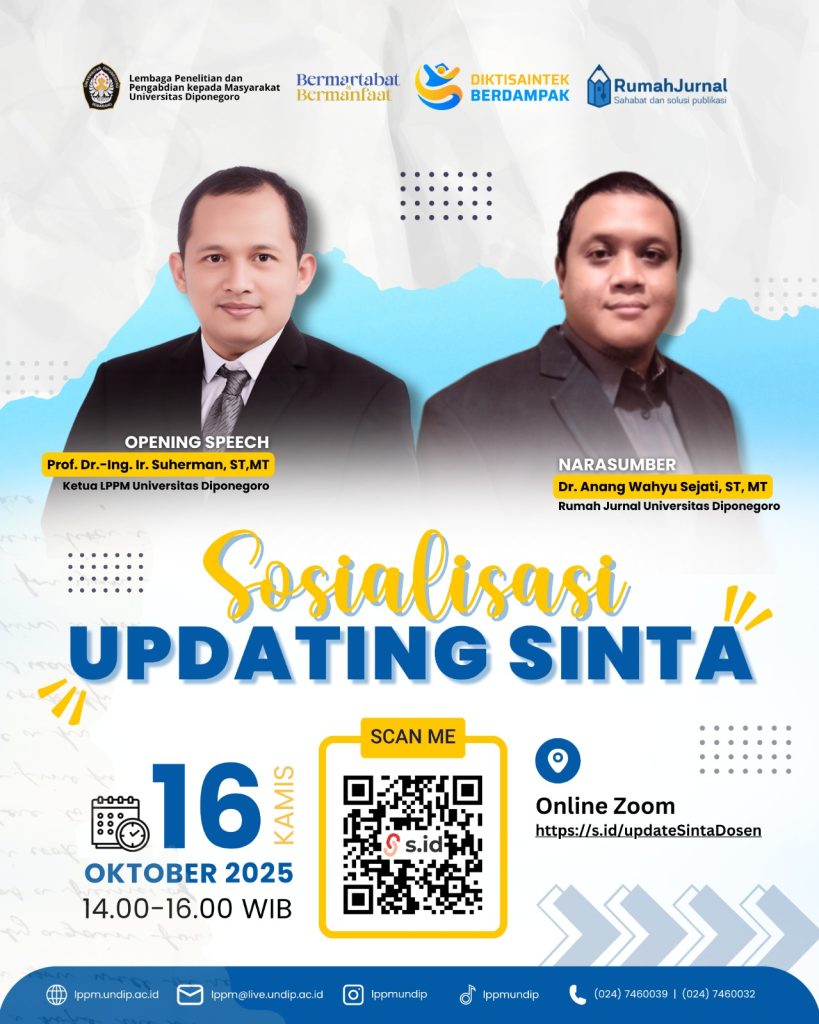 Sehubungan dengan arahan kemendiktisaintek mengenai updating profil Sinta para peneliti, maka LPPM Undip akan mengadakan tutorial updating dan layanan jika terdapat kendala akun Sinta, acara akan dilaksanakan secara daring pada: