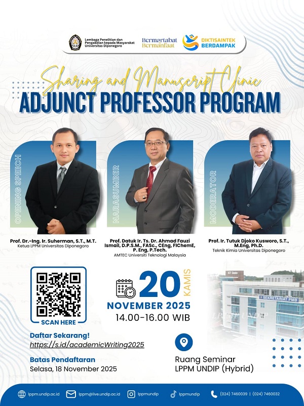Dalam rangka peningkatan kualitas publikasi, LPPM Undip dan program adjunct professor WCU (Prof Tutuk Djoko Kusworo) akan mengadakan kegiatan Sharing dan Klinik Manuskrip secara hybrid pada: